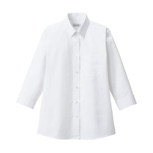 幅広いシーンで活躍する、定番ブロード生地のレディスボタンダウンカラー七分袖ブラウス。左胸アウトポケット付き。 |