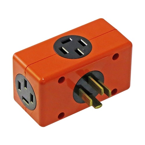 お手元のコンセント(接地3P−20A−250V)から電気工事なしで3台の機械を同時に使用できる便利なタップ。三ツ口タイプ。 |