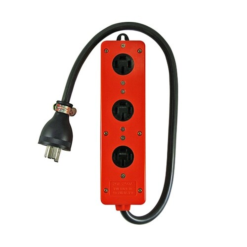 お手元のコンセント(接地3P−20A−250V)から電気工事なしで3台の機械を同時に使用できる便利なテーブルタップ。 |