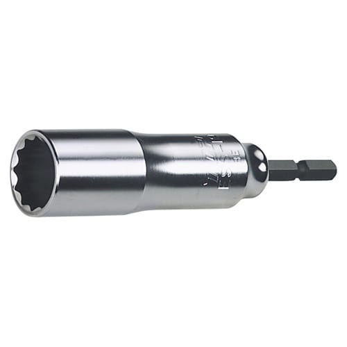 六角シャンク部とソケット部の連結は圧入式で、ねじれや折れに強いです(18V対応)。軽量化と衝撃を吸収するTOPオリジナル流線形状(外形)です。 |