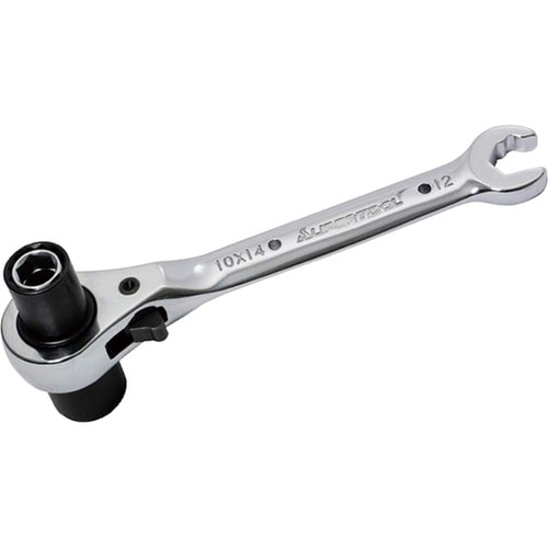 ソケット側で、4サイズに対応しています。アウターソケットを使用する場合、インナーソケットが軽い力で押し上げられ、使用後はスプリングにより元に戻ります。スパナ部(12mm)もラチェット機構です。 |