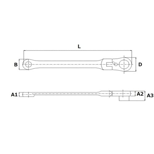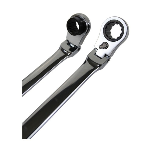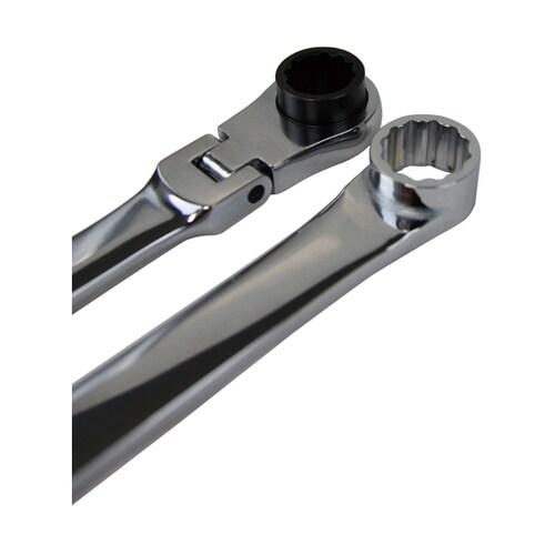 超ロングタイプで、奥まった箇所もラクラク作業できます。ギア付きメガネ部は首振りタイプで、様々な角度で作業できます。ギア付きメガネ部は正逆切り替えレバー付きで、締めにも緩めにも使用できます。 |
