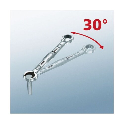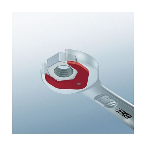 コンビネーションラチェットレンチ「JOKER」のヘッド部の両端がサイズ違いのオープンレンチになった仕様です。スパナ部分の特殊なプレート構造により、ナットやボルトが落ちることがありません。 |