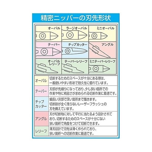 斜刃(切断面は小さい傘状)バネ付オーバルジョイント部は高精度で、遊びやガタがありません。軽量ボディーにより、作業者の負担を軽減します。 |