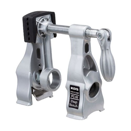 パイプを使用して拡張、締め付けが自由自在な仮止めクランプです。パイプへのねじ切りは不要です。対象物を傷めないゴムパッド付きです。片手で握って締め付けられる可動ハンドル付きです。 |