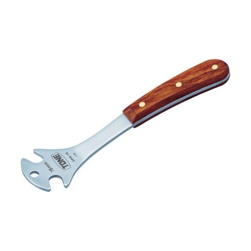 作業性を重視し、二面幅15mmを左右に配置しています。レンチがクランクに当たらないように15°のオフセットになっています。ペダルの取付・取外しに。 |