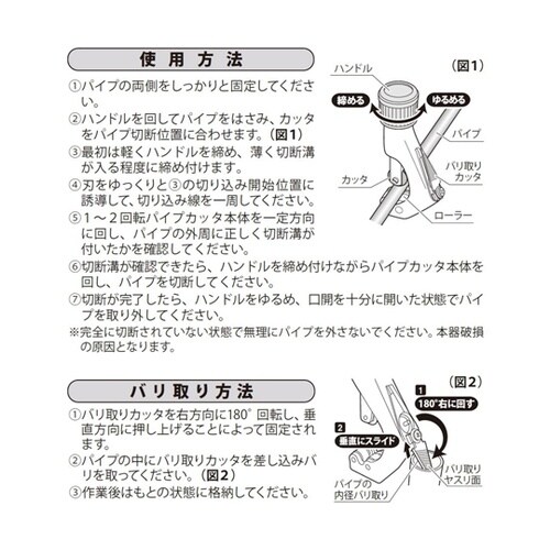 銅、鉛、鉄、アルミ、塩ビ管、ステンレスの切断に粗大ゴミを細かくカット、挟んで回すだけで簡単にパイプの切断が可能です。切り粉を出さずに切断できます。バリ取りカッター付です。 |