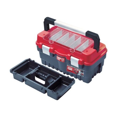 フタに壊れにくいポリカーボネート製の小物入れ付きで、中身が見やすいクリアタイプです。小物入れは可変仕切板付です。ハンドルを立てた状態でフタを開くと、小さな工具台になります。 |