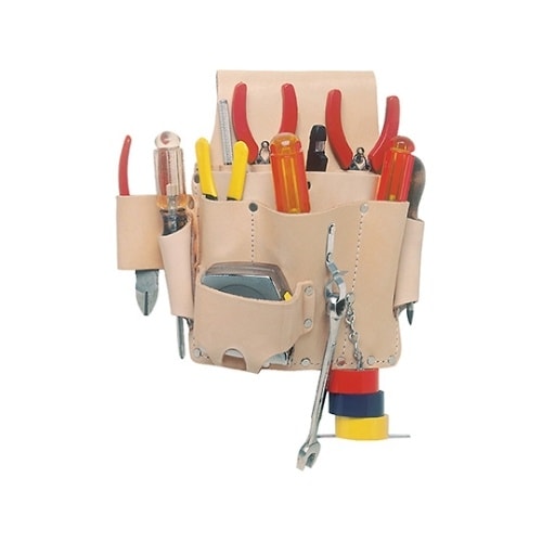 丈夫な革製のポケットには波状の仕切りがあり、ドライバーやレンチを効率よく収納できます。テープを吊るす事ができるチェーン、革製ハンマーホルダー、クイックリリース式のスナップ、メジャーホルダー付き。 |