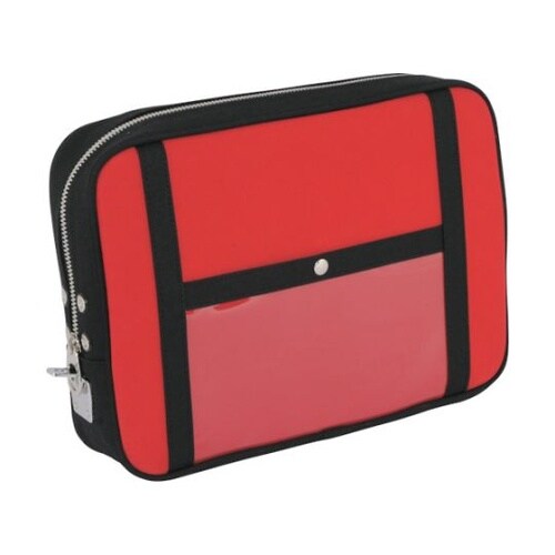 擦り切れに強く、耐久性に優れた帆布生地を使用したポーチです。南京錠で施錠可能な金具の付いたタイプです。片面に宅配伝票用透明ポケットが付いているので梱包無しでそのまま配送することができます。 |