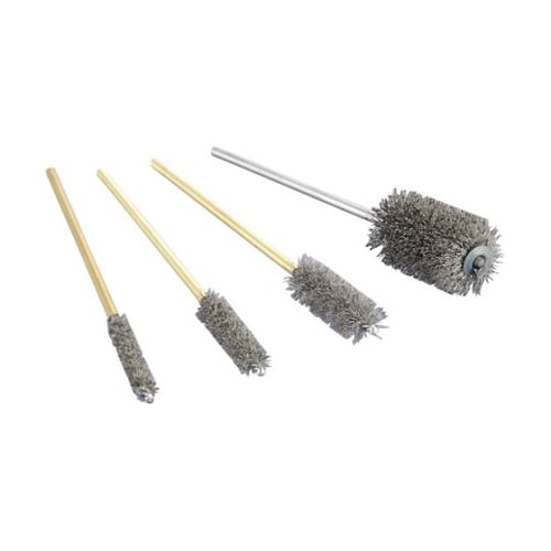 ステンレス線を芯線により、スパイラル状に固定しています。全長が長く(100mm)、通常のブラシでは対応できない奥行を加工できます。円筒内面、ねじ穴、パイプ内面、交差穴、曲面のバリ取りに最適。