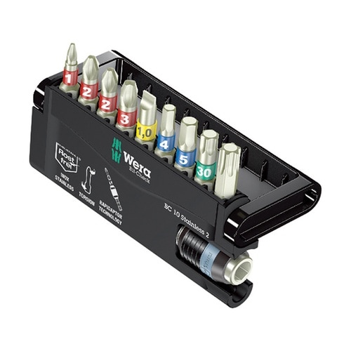 ステンレストーションビットのセットです。日本でよく使用されるサイズをコンパクトにまとめています。バイトーション(衝撃対応)タイプです。 |