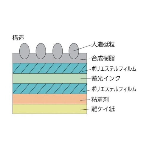 高輝度タイプの蓄光材を使用しており、暗所での誘導表示などに適しています。カーボンニュートラルガス使用により、従来比61%排出量を削減しました(製造時)。屋外用。消灯時の階段、出入口、通路。 |