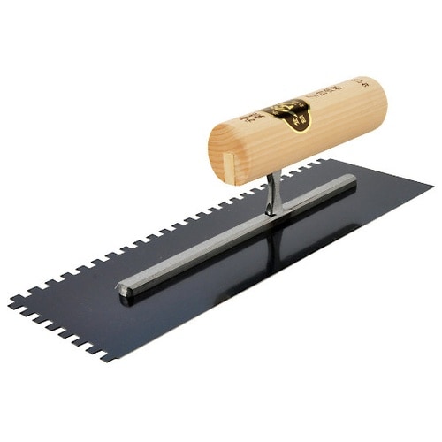 本職用クシ目角鏝です。接着タイプで、背金はしなりの出ないクシメ専用を使用。 |