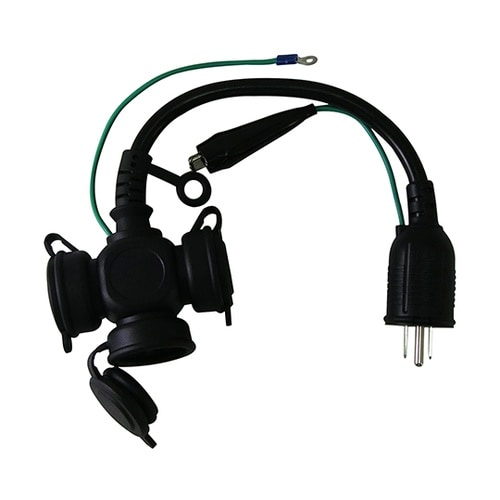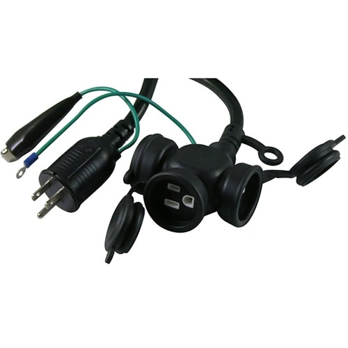 二芯、三芯兼用プラグ付防雨型延長ケーブル。三ツ口タイプ(アース付)二芯での使用時はプラグについているアース線を押し込むことにより二芯にも使用できます。 |
