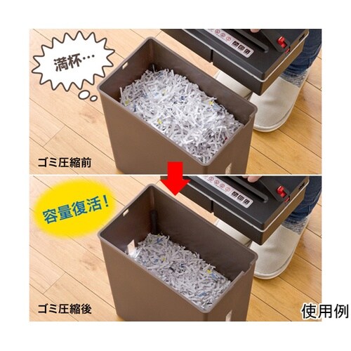 A4用紙10枚を5×43mmに細断できるペーパーシュレッダーです。ハンドル部分を押し込んで細断くずを圧縮でき、くず慣らしの際手が汚れません。ハンドル部分はロックすると持ち運び時にも使用できます。 |