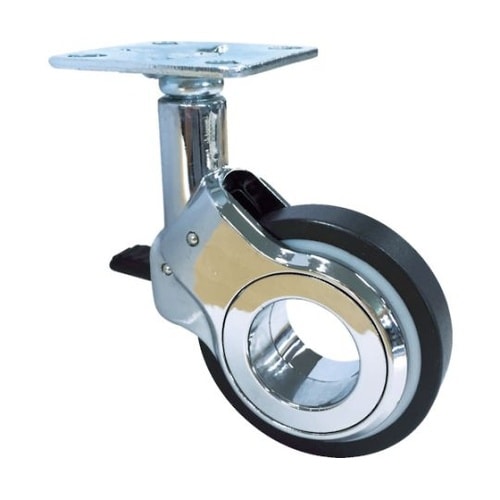 車輪中央部が空洞になっているデザイン性の高いキャスターです。ほこりなどが溜まりにくい形状にもなっています。シェルフ箪笥、ワイヤ家具、イス、デザインカートのホイールに使われます。 |