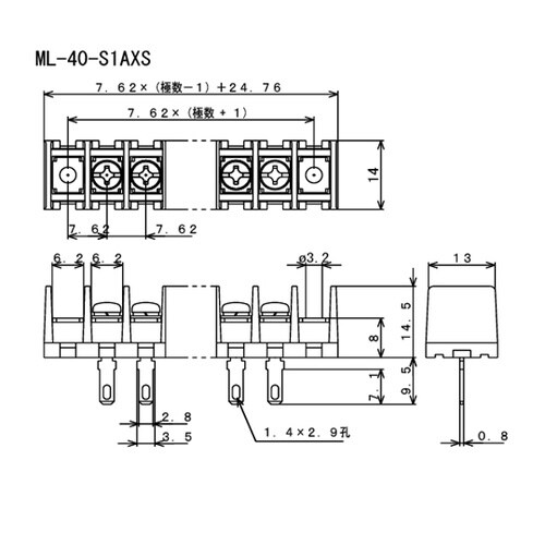 貫通型ねじ式端子台 M3セムスねじ 7.62mmピッチ 10A 250V 20極 裏側はんだ付110タブ端子 ML−40−S1AXS−20P ML−40−S1AXS−20P 1個