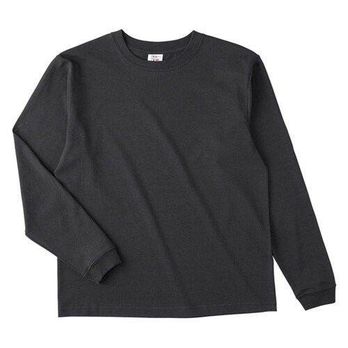 オープンエンドの糸はふっくらとしており、ボリュームがある一方で、ドライでざっくりとした印象です。リブ有リロングスリーブTシャツです。