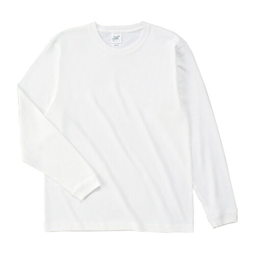 オープンエンドの糸はふっくらとしており、ボリュームがある一方で、ドライでざっくりとした印象です。リブ有リロングスリーブTシャツです。