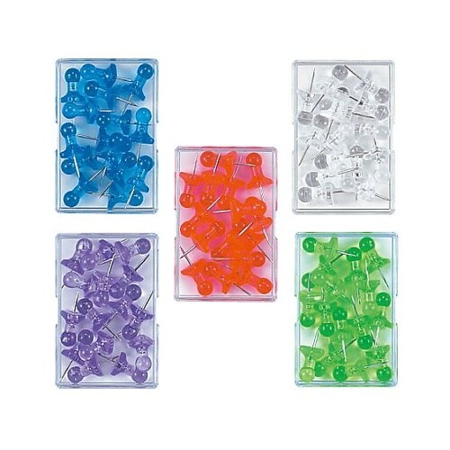 落としても転がりにくく針が上を向きにくい設計。頭部先端が丸型の指にやさしいカラーピンです。クリアカラー5色採用。POP効果もあり、フックも出来ます。 |