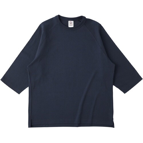 オープンエンドの糸はふっくらとしており、ボリュームがある一方で、ドライでざっくりとした印象です。リラックスシルエットのラグラン7分袖Tシャツ。