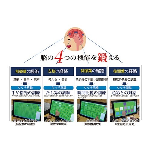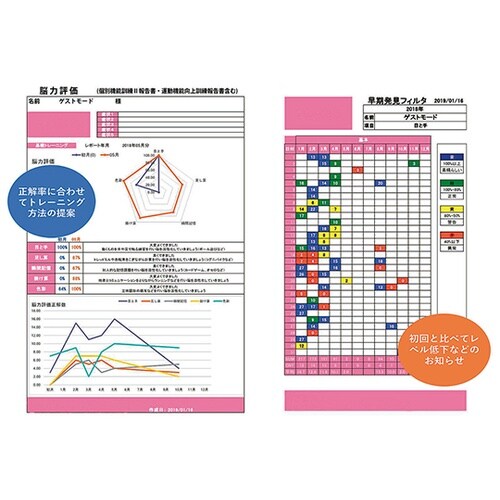 脳の活性トレーニングと評価が可能トレーニングデータを元に,、訓練評価と障害早期発見判定を行えます。常に初回データと対比した利用者の進捗状況を把握でき、目標の達成度合いがわかります。 |