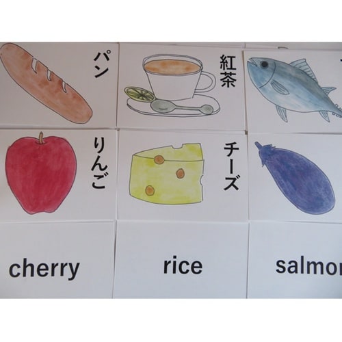 よく見る食べ物の英単語を楽しく学べるカードです。表面には英単語が、裏面にはその食材の絵と日本語が書いてあります。カードを楽しみながら英語で遊んでみませんか?分からなくてもOK。 |
