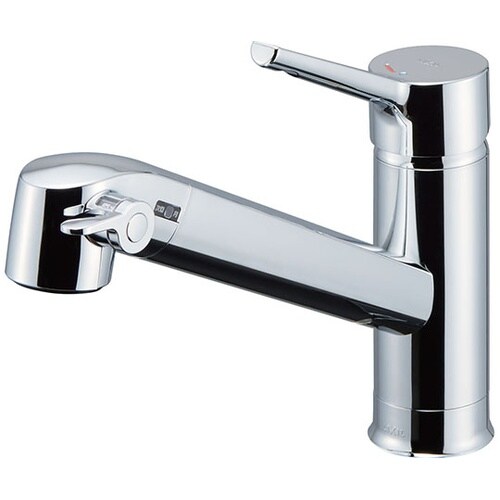 キッチン用、浄水器内蔵ハンドシャワー付、ホース引出タイプのワンホールシングルレバー混合水栓。お湯が混合する位置をクリック感でお知らせするエコハンドル。 |