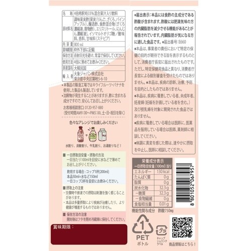 国内で機能性表示食品(酢酸の働き肥満気味の方の内臓脂肪を減らすのを助ける)を取得した100%発酵酢から作られた果実のお酢。酸で分解されない穀物由来のイソマルトオリゴ糖を使用。 |