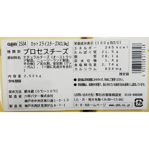 チェダーチーズがベースのスライスチーズです。標準74mm角(標準14g/枚)で2.5kgの大容量タイプです。 |