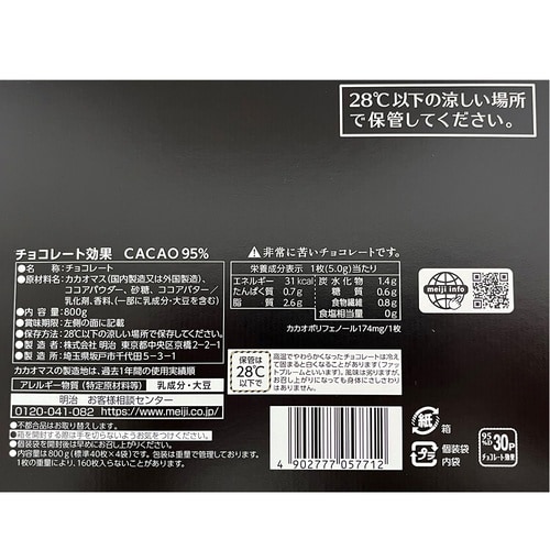 美と健康を考えた、高カカオポリフェノール。華やかな香りと上質な苦み。チョコレート効果95%の大容量商品です。明治チョコレート効果カカオ95%は、大容量800g(約160枚)であります。 |