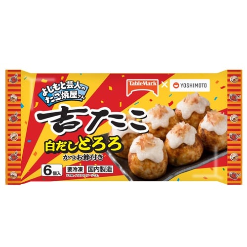 吉本興業所属芸人が考案したたこ焼が冷凍食品で商品化。「吉たこ」店舗でも人気のフレーバー。だしが効いたとろろと鰹節の風味が他にない、上品な味わいのたこ焼です。 |