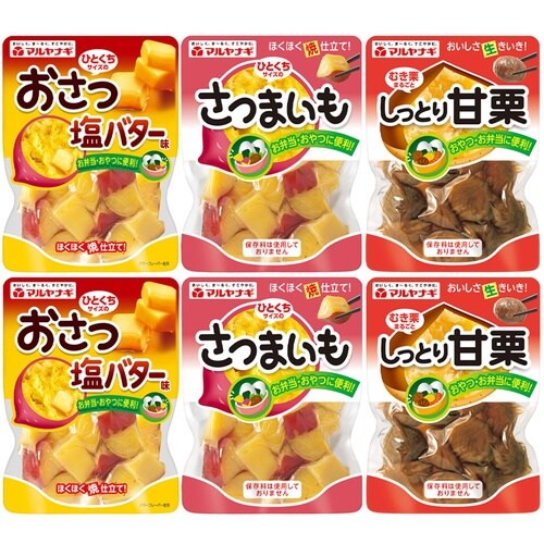 マルヤナギ小倉屋 ひとくちサイズのおさつ塩バター味 120g×2個/マルヤナギ小倉屋 しっとり甘栗 93g×2個/マルヤナギ小倉屋 ひとくちサイズのさつまいも 120g×2個/を詰め合わせております。 |