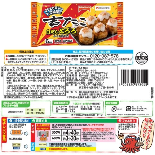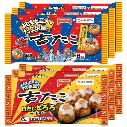 [冷凍] テーブルマーク 吉たこ 白だしとろろ 6個×3袋/[冷凍] テーブルマーク 吉たこ 塩こんぶ&マヨネーズ風ソース 6個×3袋/を詰め合わせております。 |