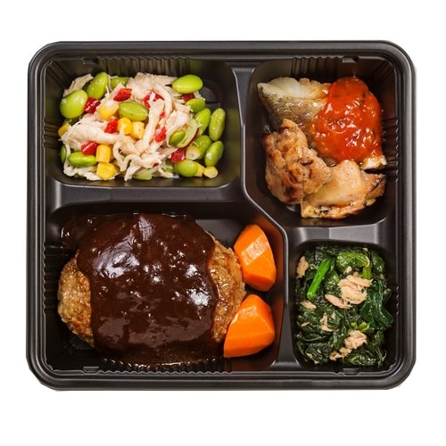 たんぱく質、カロリー、塩分に配慮しています。カロリー361kca/lたんぱく質31.3g/食塩相当量2.4g。肉又は魚の主菜2品+野菜つけあわせ2品の素材が豊富で彩りの良い御膳です。 |