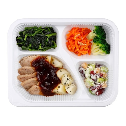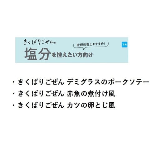 きくばりごぜんシリーズは1食あたりカロリー300kcal以下、塩分2.0g以下、野菜使用量100g以上の冷凍総菜セットです。野菜使用量…芋類きのこ類海藻類豆類を含む。生鮮換算。 |