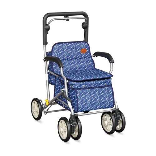 体格に合わせてハンドルの高さを4段階(84ー92cm)に調節できます。前輪のダブルキャスターは、固定回転左右45°が選べます。傘、杖ホルダー付。 |