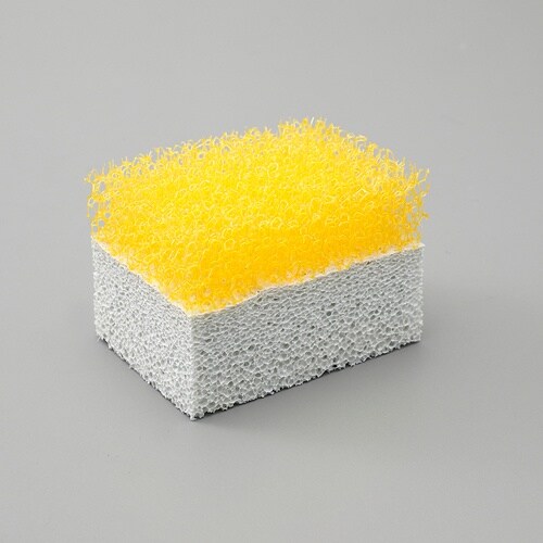 異なる素材のスポンジが毛足を傷めることなく汚れを効果的に取り除きます。黄色:発砲したスポンジが、繊維に溜まったホコリや汚れをかき出します。グレー:やわらかいスポンジが汚れを吸着します。