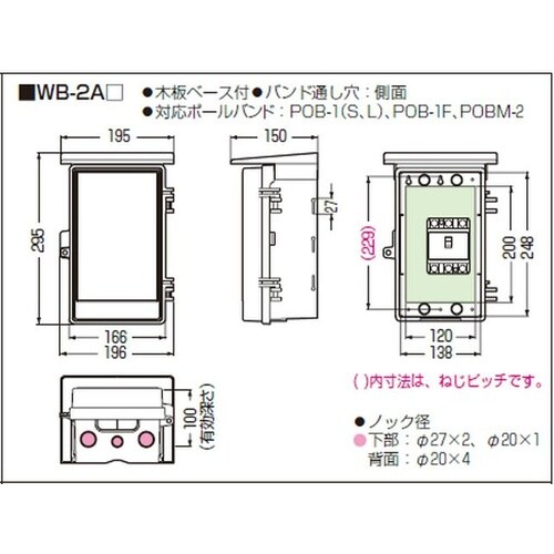 メーカー:未来工業 | 型番:WB−2AJ | 取付スペース:ELB:3P・60A×1 | ボックス外形寸法:295×196×150mm | 有効深さ…