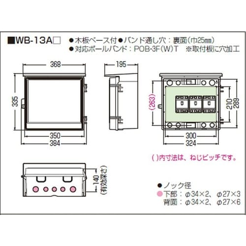 メーカー:未来工業 | 型番:WB−13AR | 取付スペース:ELB:3P・60AF×3配電箱:30A×2 | 外形寸法:335×384×195mm…