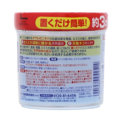 内容量:350g | サイズ:φ92×103mm | 対象動物:ネズミ | 効果持続時間:約3か月 | 成分:天然ハッカ油、天然ワサビオイル、天然琉球…