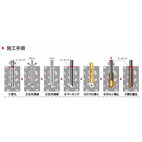 エポキシアクリレート樹脂および骨材と、硬化剤を別々のガラス管に収容したダブル溶閉タイプのケミカルカプセル接着系あと施工アンカーです。