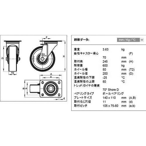 仕様:自在ストッパー無 | 車輪径×幅(mm):200×50 | 全高(mm):245 | 耐荷重(kg):600 (4km/h時) | タイヤ硬度:…