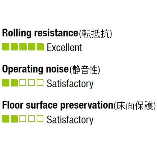 一般的なナイロン製車輪に比べて耐荷重・圧力強度・弾力性・形状復元性に優れており、地面を転がる際の抵抗も少ないです