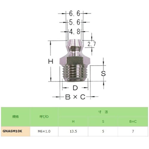 メーカー:栗田製作所 | 型番:GNA6M10K | ねじサイズ:M6×P1.0 | 形状:ストレート | 材質:真鍮(ニッケルメッキ) | 入数:5…