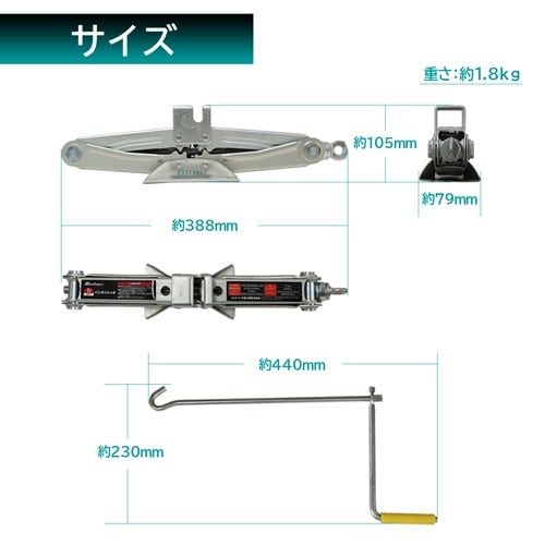 メーカー:大自工業(Meltec) | 型番:FA−1 | 用途:車載に便利!タイヤ交換・パンク修理、タイヤチェーンの脱着に | 能力:1t(最大揚程…