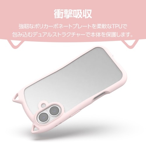 猫耳型のアクセントが可愛らしく、背面のクリアパネルで端末本来のカラーを活かしながら、遊び心と実用性を兼ね備えたハイブリッドケースです。