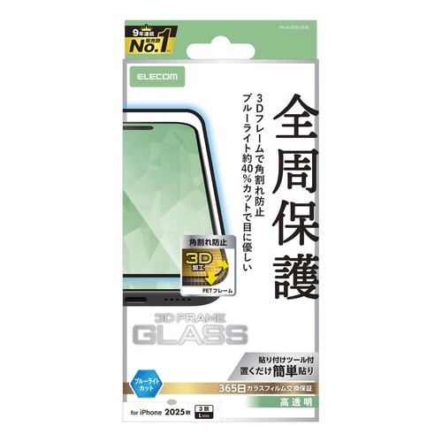 エレコム iPhone 17 Pro Max ガラスフィルム 高透明 ブルーライトカット 全周保護 黒 A067-6877