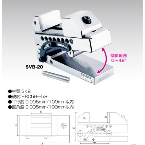 ■サインバー方式の精密バイスで46°まで傾斜させて使用できます。■ブロックゲージを使って正確に角度設定ができます。■丸棒のクランプに便利なV溝付移動ジョウ